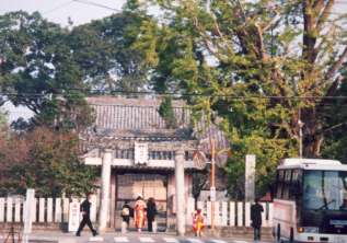 秋のお遍路さんは、華やかな黄葉を見上げながら門を潜っていく。