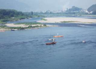| ●川漁をするカンドリ船 | ●阿波町と山川町を結ぶ潜水橋 | ●中州に広がる農耕地 |