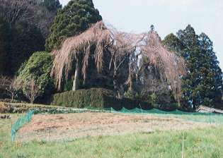 いた。一方に大きく棚引いた樹形で、別名を釣鐘桜。主幹に大きな損傷があるが、不定根が長く這い下りてや