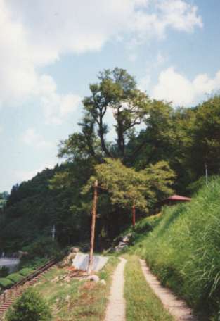 へ上る小道が南西へ上っている。桜はその道の先の山の鉄塔の元にあり、2幹に分かれた健康な樹影