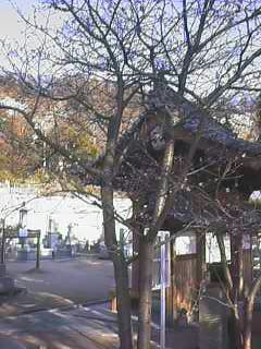 十六日桜 (冬桜、孝子桜)巨木ではないが真冬に薄紅の花をつけ珍しい。昔のものは空襲で焼け、現在
