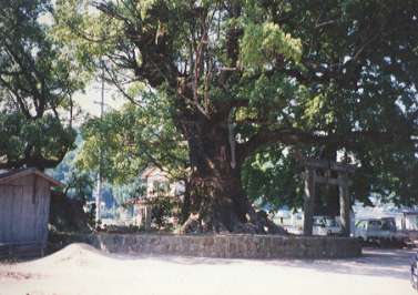 八幡神社の鳥居横には、台状に丸く囲われた石組みの上で繁茂する大きな楠があった。その渋くえんじ色