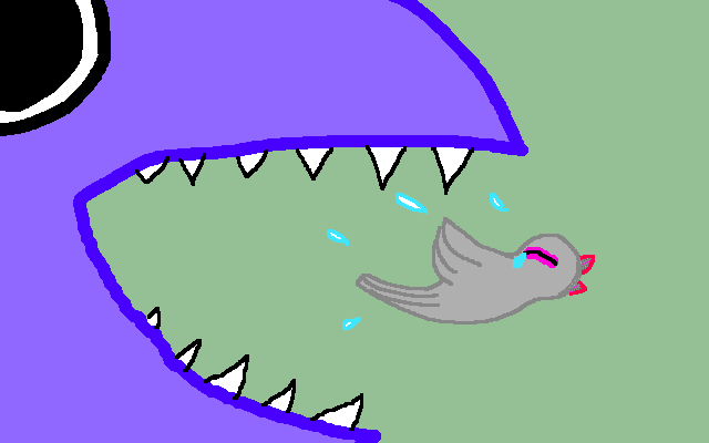 「見かけないやつだな。腹がへってるんだ。食ってやる!」