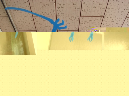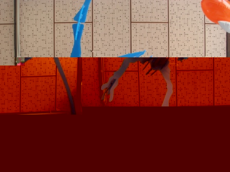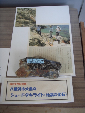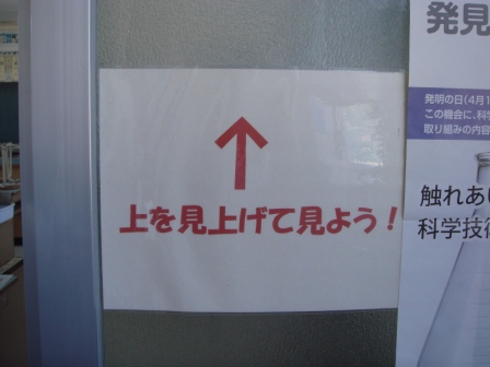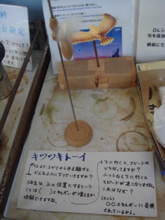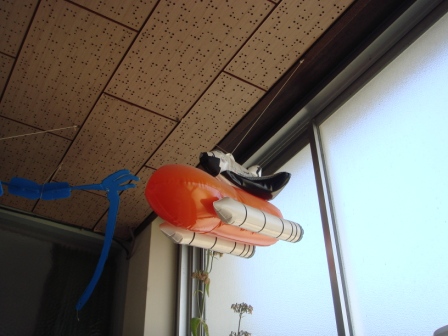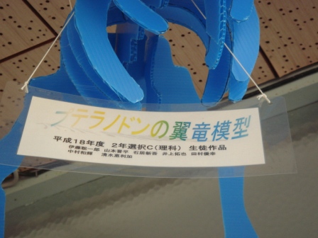 理科室の入口手前 天井には、プテラノドンの翼竜模型がお出迎え(生徒が選択理科で作った模型です)