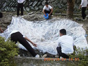 できるだけ、土をかぶせて、自然に近い池となるよう工夫しました。