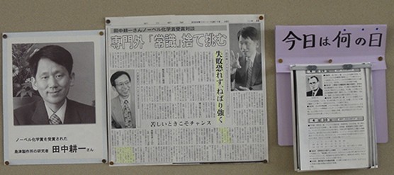 洗い場は100円ショップの物品でビーカー等が割れない工夫をしました。 田中耕一さんの新聞記事 今日は何の日コーナー