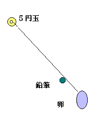 | 落体の法則 | ![]() | 重さが変わっても落ちる速度は同じ(ガリレオのピサの斜塔から鉄玉を落下した実験でも有名) 5円玉と卵を図のように糸でつなぎ、途中に鉛筆を置く、5円玉を上にして手を離す。卵が落ちるように思うが、実際は5円玉にも重さがあるので卵と同じ速度で下に落ちる。そのため、鉛筆に5円玉が巻き付き、卵が落ちない。この実験を見せた後で、前時に学習した落下の速度は重さに関係しないを考えさせる授業も考えられる。 (2000.12.5伊藤家の食卓より) | |