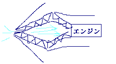 | 小型化高出力の仕組み | ターボエンジン | マッハ3.3を出す世界最速のジェット機(別名 『黒い翼』)は、音速になるとジェットエンジンの前に円錐状のものを伸ばして、音速を超えるときの衝撃波を使って空気を圧縮してエンジンの出力を高めている。![]() | |