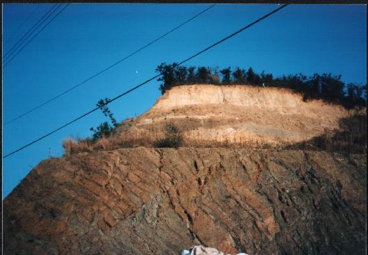| 教科書(教育出版)でも紹介された不整合 | 愛媛県にお手本のような不整合がある。 | 愛媛県の双海町から海岸線を松山に向かって走ると、海岸から松山に向かって上る坂道がある。その坂道を上りきり、少し下ると左側に日滝工業という会社がある。そこにある露頭がすごくきれいな不整合である。 | |