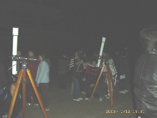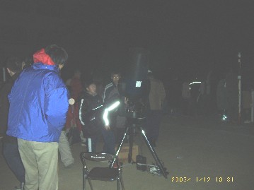 15分ほどの説明後、さっそく運動場に出て観測を始めました。途中、マイクのトラブルもありましたが、月のクレーターを観測しました。そして、双子座、オリオン座、カシオペア座などを確認しました。30分ほど経つと、冬の第三角形も確認できました。(左は、中学校にあった天体望遠鏡です。)