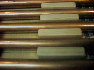 これがアップ。ちゃんと間隔を計算してますよ。 パイプの直径が8mm、パイプの間隔が15mm、6mm×8mmの木の棒を 30mmに切断してボンドで張り付けました。ちょうどいい具合。