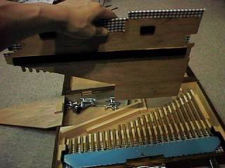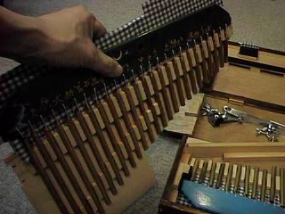 上の段の収納 もう一つは中板にセットして 上に置く。 下側の周りに木片を貼り中板を浮かせる様にしてます。 中板の裏にはフェルトを貼ってある。 フレームが中で暴れない様に考慮してます。 上からもフェルトで挟む様にしてます。 持ち運びでもウィンドチャイムはカタカタ鳴ったりしない。 下の段の収納