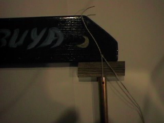 フレームの材料は何でもいいのですが、適当な大きさのモミ材料(9x45x600)を使用しました。パイプの間隔と糸の長さは鳴りに関係します。糸の長さは後で調整出来るけど穴は開け直しが難しいので、試しにいらない木に穴を開け数本吊ってみました。