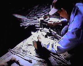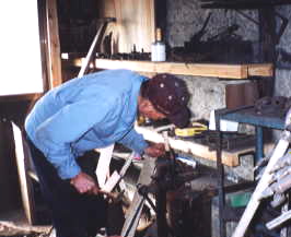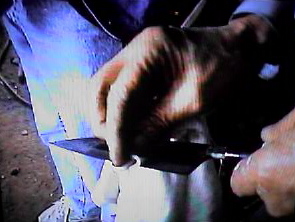 柄をつける。バイスに挟んで木の柄を叩いて取り付ける。