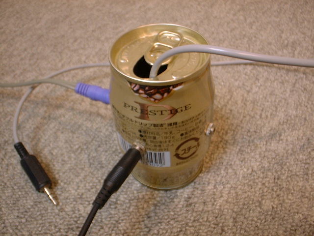 缶の穴から半田ごてを挿入して、各端子をつけるのは苦労しました、と言うのは冗談で、ミクロマンに頼んで…と言うのも冗談で(しつこい!?)、外で接続してから、ひとつづつ入れました。4つの各穴からこよりの様な糸を通し、引っ張りながら穴に導き出すと言うテクニックです。