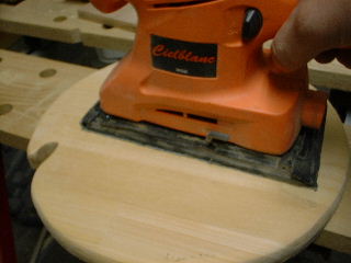 まず材料の表面にサンダーをかけます。材料はパインの集成材です。前回のスピーカキャビネットの製作時に、ジグソーでくり抜く時にドリル穴を開けたので滑らかなカーブの切れ込みに加工しました。