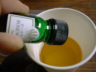 香り付けにアロマオイルを入れました。アロマオイルを初めて購入しましたが、いろいろ種類があるんですね。3mlで600円です。結構高いものです。使ったのは数滴…のつもりが10滴くらいトポトポと入りました。