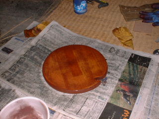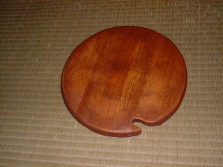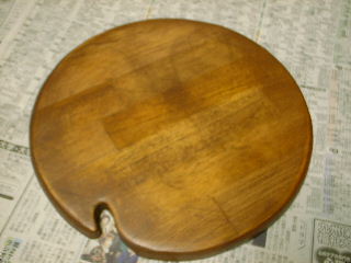 数日後そのサンプル商品が送られてきました。一ヶ月以内に使ってみてアンケートを返すのがモニターの条件なので、何か塗るものがないか考えたけど、適当なものがありません。そこで、ちゃんとした作品じゃなくても、単に木に塗ってお試しすればいいんじゃないかってことで、花瓶の敷板を製作しました。 前回製作したスピーカキャビネットでスピーカの前面板の穴あけした残り材を利用したのです。たまたま花瓶の敷板となった訳です。