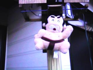 本体のモーターが回転して糸を巻き上げ、どすこい君が徐々に吊り上げられていきます。