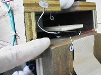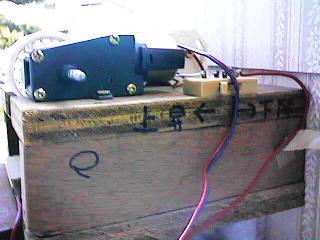 モーター、電池ホルダー、ラジコンカーのホイールベースで作った巻き上げリール、極性切り替えスイッチ、