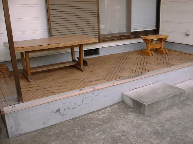いつかは本格的なウッドデッキを作りたいと思っているこーさくですが、これはコンクリ打ちっぱなしの上に30cm角のデッキパネルを敷き詰めただけのものです。そして枠を2x4材で囲みました。デッキパネルは従妹が車の展示に使ってたのをもらってきたものです。つまりタダ。枠の2x4材はレッドシダーを通販で入手しました。レッドシダーはホントに耐久性がよいのかを検証すべく防腐剤などの塗布なしで敷いています。